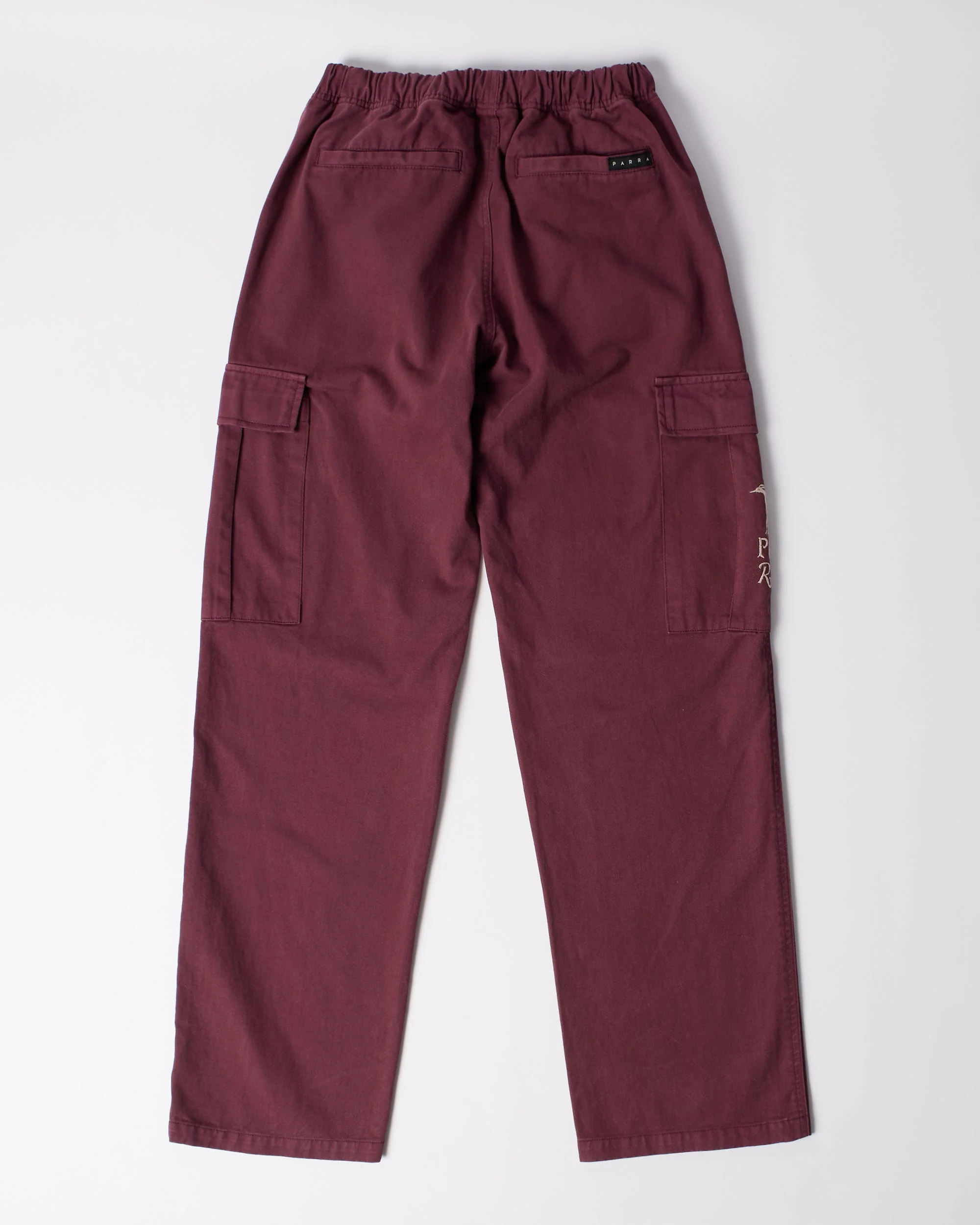 Baggy fitted cargo pants with big pockets on both legs. Embroidery on one of the pockets.